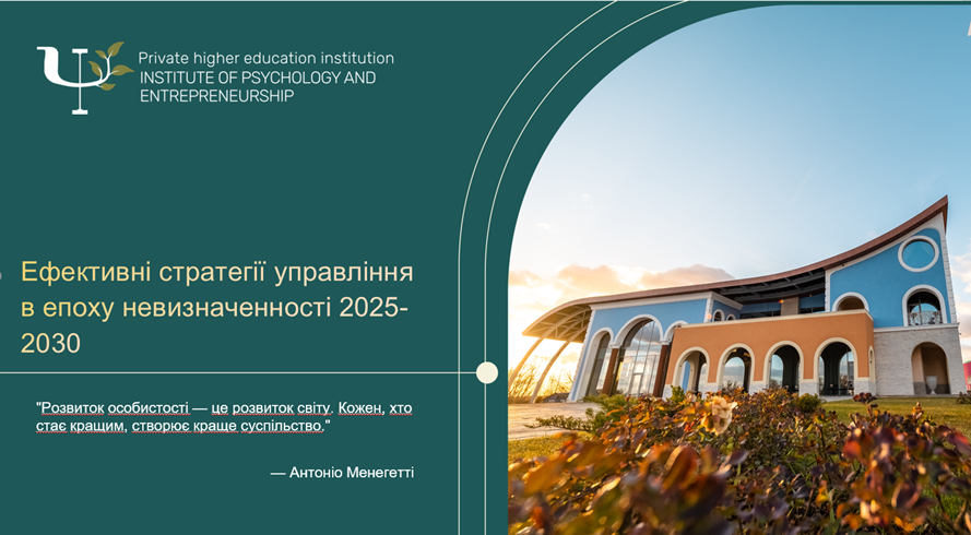 - Приватний вищий навчальний заклад «Інститут психології і підприємництва» – «Ефективні стратегії управління в епоху невизначеності 2025-2030». У фокусі — невизначеність як нова реальність і водночас точка зростання, роль зрілої особистості в управлінні, формування нових стратегій розвитку та створення можливостей у періоди трансформацій.