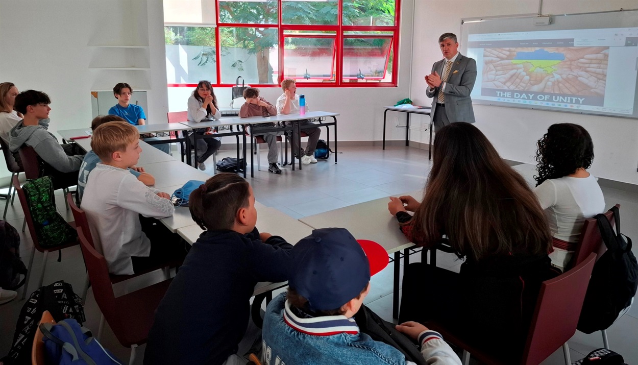 Під час зустрічі пан Посол обговорив з учнями поняття соборності, провів паралелі між Днем Соборності України та Днем єдності ОАЕ, а також на прикладах пояснив, чому ця дата є не менш важливою для української державності, ніж День Незалежності.